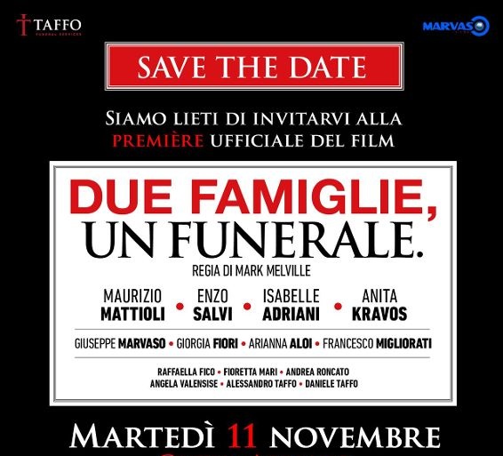 “Due famiglie, un funerale” è una commedia diretta da Mark Melville, con una durata di 90 minuti e prodotta da Marvaso Production Films, in collaborazione con Taffo Funeral Services. Il film vede protagonisti Maurizio Mattioli nei panni di Peppino, Enzo Salvi nel ruolo del maldestro collaboratore Spartaco, Isabelle Adriani come Helena e Anita Kravos nel ruolo di Lidia. Tra gli altri attori ci sono Giorgia Fiori (Luna), Giuseppe Marvaso (Luigi), Arianna Aloi (Anna), Francesco Migliorati (Michele), Fioretta Mari (Olimpia), Andrea Roncato (Dottore), Angela Valensise (suocera), Raffaella Fico (Lucrezia), Alessandro Taffo e Daniele Taffo (se stessi).