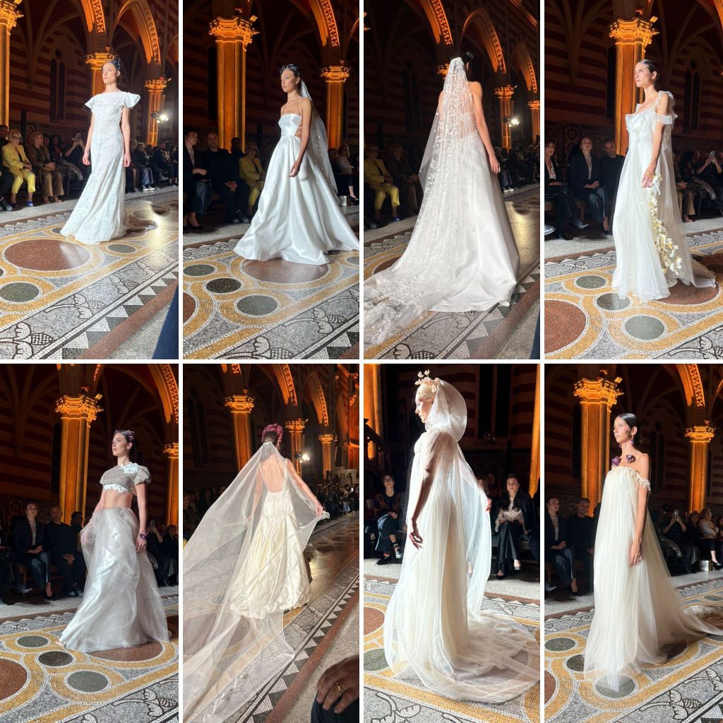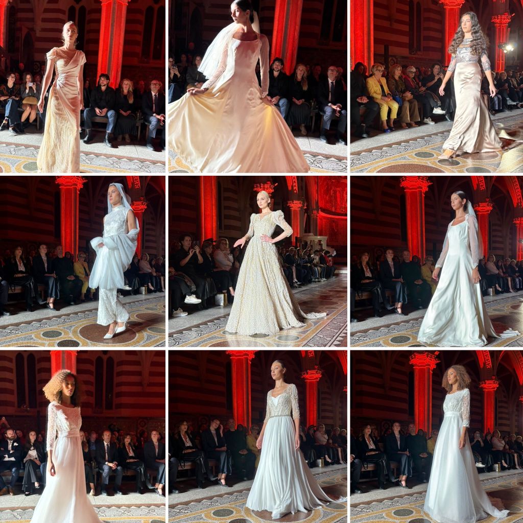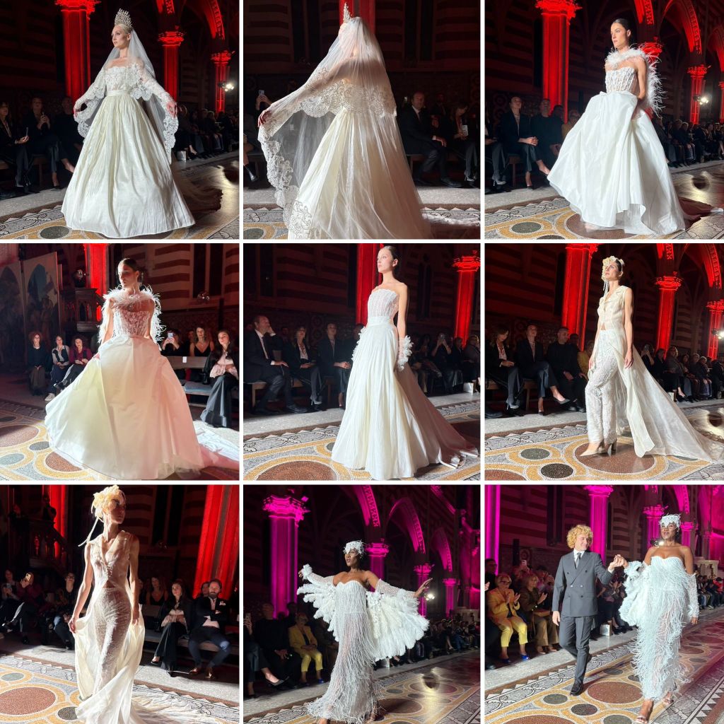La chiusura vede protagonista un giovane che solo lo scorso anno ha debuttato proprio in questa manifestazione che ci aveva ammaliato con le sue creazioni lo stilista Elio Guido. Una collezione di alta moda sposa dal titolo “Muse”. Un viaggio a doppio respiro: un battito che unisce l’anima dell’arte a quella della vita. È un canto d’amore dedicato alle donne che lo hanno ispirato, alle sue clienti. Ogni abito nasce come un ritratto su misura. Allo stesso tempo “Muse” si dischiude come una mostra d’arte. Le Madonne di Raffaello sussurrano grazia e purezza, la teatralità di Caravaggio vibra nell’opulenza dei materiali e nei ricami e La Venere di Botticelli irradia leggerezza e delicatezza, creando abiti che sono al contempo scultura e sogno. Ogni uscita una rappresentazione scenica che ha coinvolto il pubblico: non solo abiti, ma sogni ad occhi aperti.