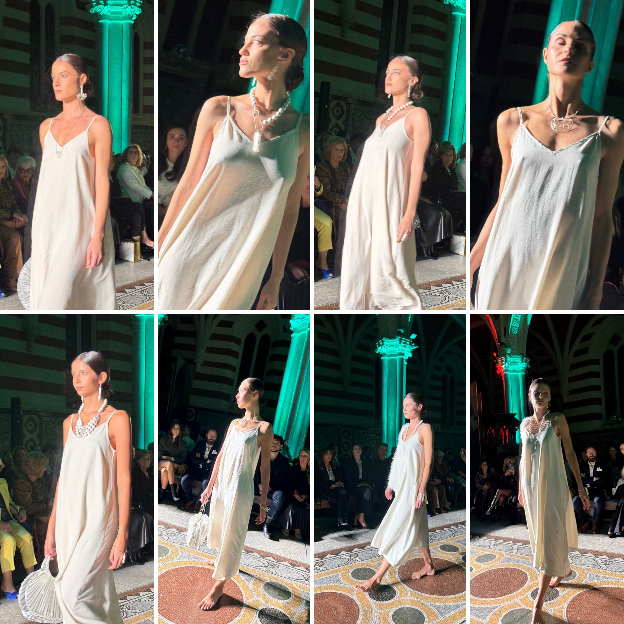 Gaia Caramazza, fondatrice del brand Gaia Italian Handmade Jewellery, ci ha avvolto di eleganza e sensualità proponendo nel terzo quadro moda un tributo all’artigianalità con la sua nuova Collezione “Incanto”. Gioielli unici in argento, che hanno come elemento distintivo la selenite, una pietra che lascia filtrare la luce fra i suoi strati trasparenti e che è caratterizzata da molteplici proprietà, purificanti e calmanti, preziose per stabilire armonia e pace. In passerella, oltre ai gioielli, abbiamo visto borse e accessori che contengono il seguente messaggio: “scegliere un oggetto artigianale ci dà la possibilità di avere qualcosa realizzato e ideato per la nostra persona e per ciò che ci rappresenta”. La bellezza non sta nella perfezione, ma in ciò che meglio ci identifica. Ogni anello, bracciale o collana delle collezioni è frutto del dialogo tra una progettualità che si sviluppa fra l’armonia e lo charme del gioiello antico e il design contemporaneo, raffinato ed originale.