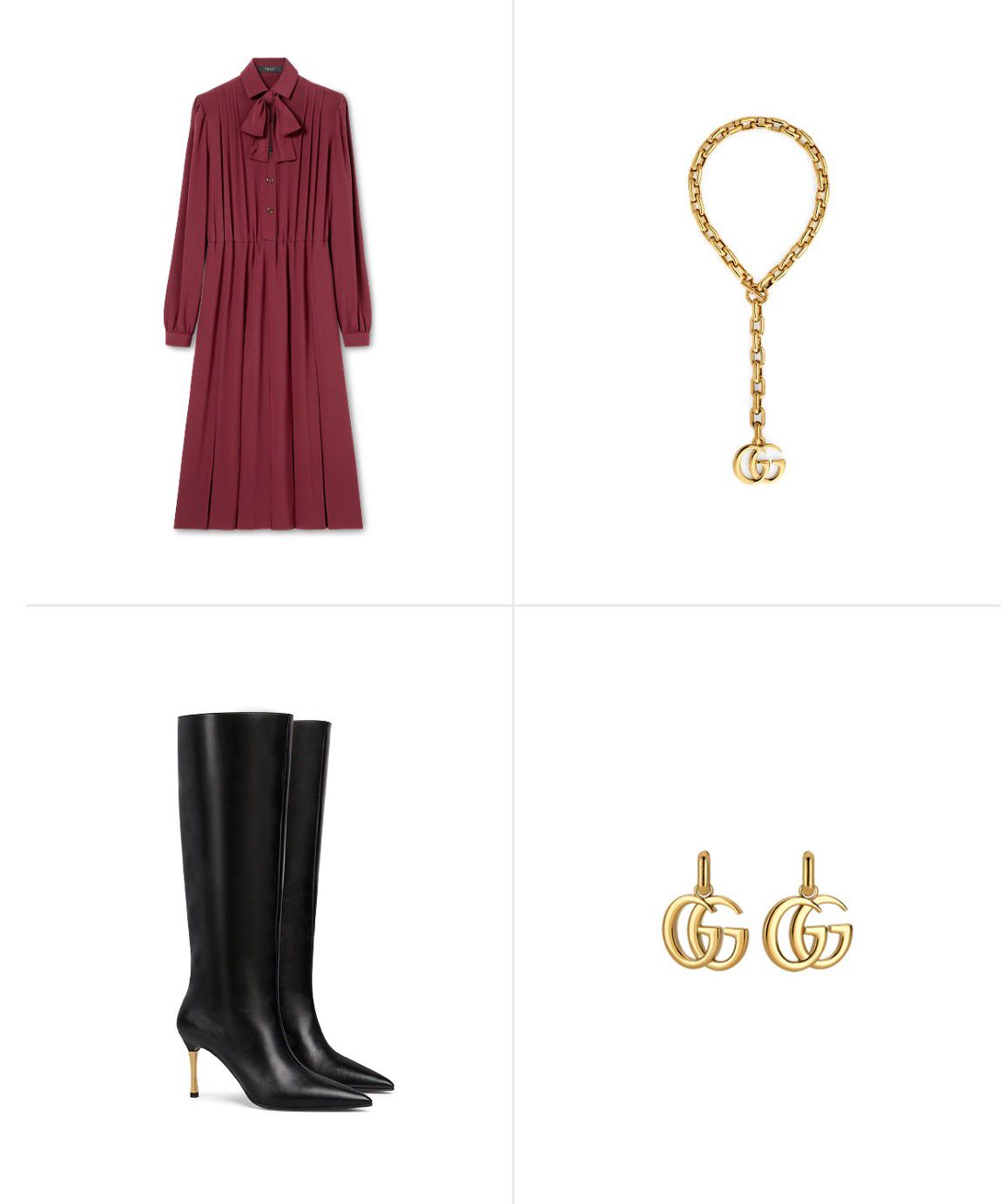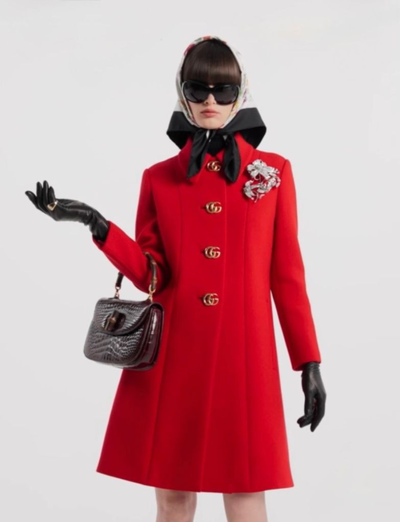 Caratteristiche di un mood di classe intergenerazionale: il foulard, la scarpetta con tacco 6, il cappottino con bottone gioiello, una borsa piccola e di ottima fattura. L’abito longuette magari bordeaux che Gucci propone con bottoni logati o orecchini GG Marmont.