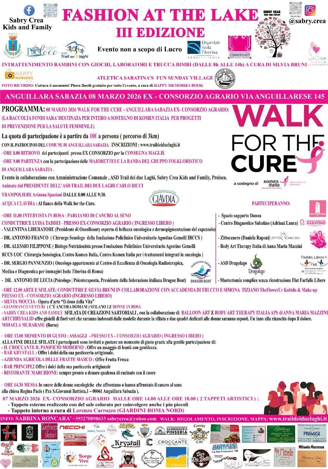 CHI: L’iniziativa nasce da un’idea di Sabrina Roncarà, in collaborazione con Susan G. Komen Italia e con il patrocinio del Comune di Anguillara Sabazia. All’organizzazione partecipano anche l’Amministrazione Comunale, l’ASD Trail dei Due Laghi, Sabry Crea Kids and Family e la Pro Loco di Anguillara Sabazia.