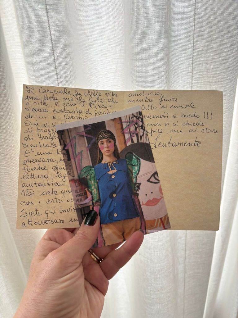 Abiti colorati con accostamenti audaci. Sovrapposizioni, trasparenze. Ho particolarmente apprezzato gli orli smerlati. Alcuni abiti con pochi gesti permettono di passare da un look giorno ad uno sera o da un look più formale ad uno più sbarazzino. Rispettando pienamente la filosofia di Atelierd.isagio, da sempre orientata verso una moda trasformabile, reversibile, modulare e unisex, capace di adattarsi ai corpi e alle identità senza imporre definizioni rigide. Grande attenzione anche agli accessori, realizzati grazie a collaborazioni mirate con realtà artistiche indipendenti. Per i bijoux, Isa Giovannozzi ha scelto di lavorare con l’artista poliedrica Vincenza Biancongino – Mulier Insolens; le borse sono firmate TheCrabbyLab, mentre i copricapi nascono dalla creatività delle ragazze di unConventionaLpeople. Un dialogo tra visioni diverse che rafforza l’identità collettiva del progetto.