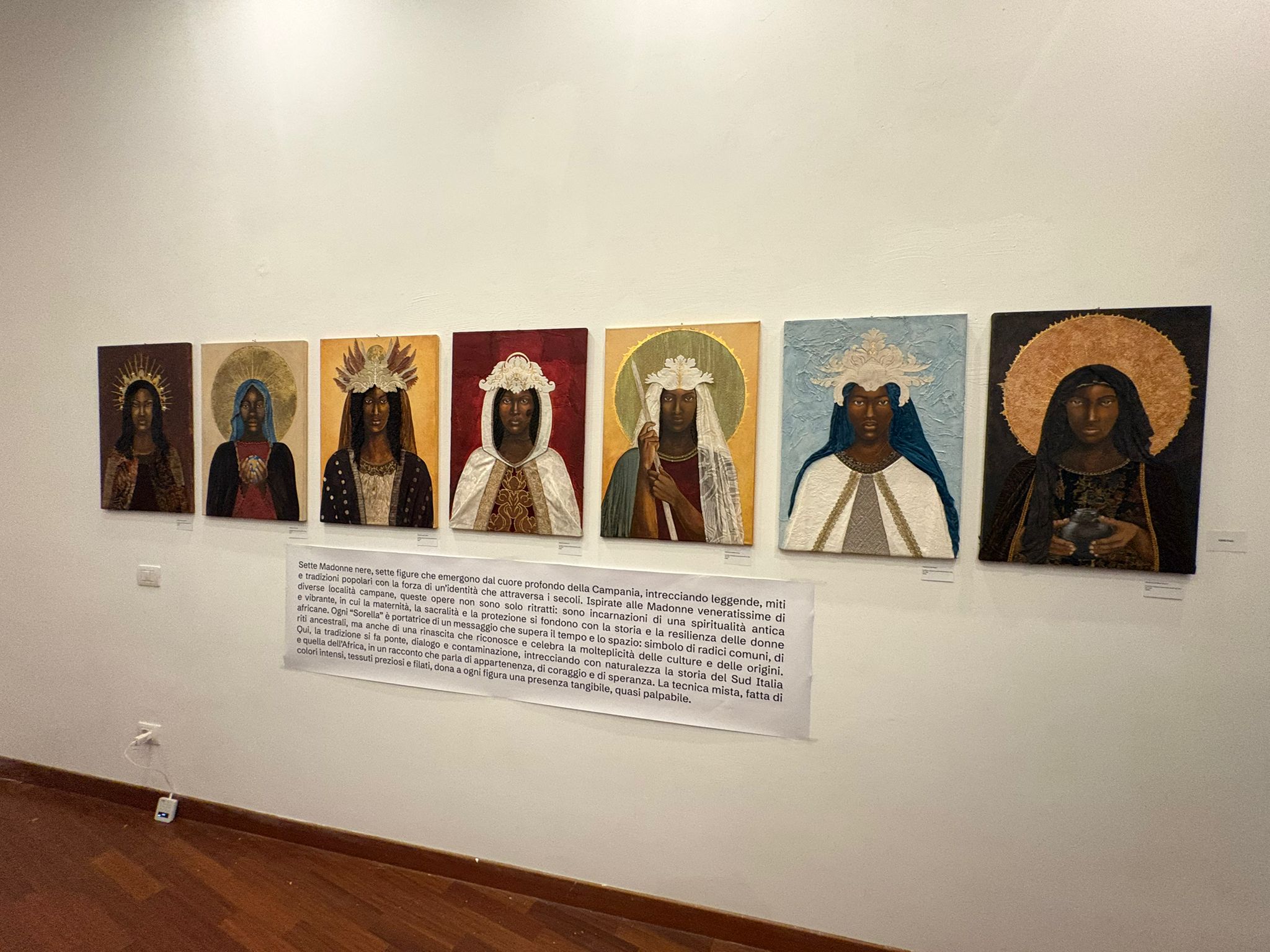 Appena entrati in galleria, lo sguardo viene catturato da un ciclo di opere dal forte impatto simbolico: “Sette Madonne nere”.