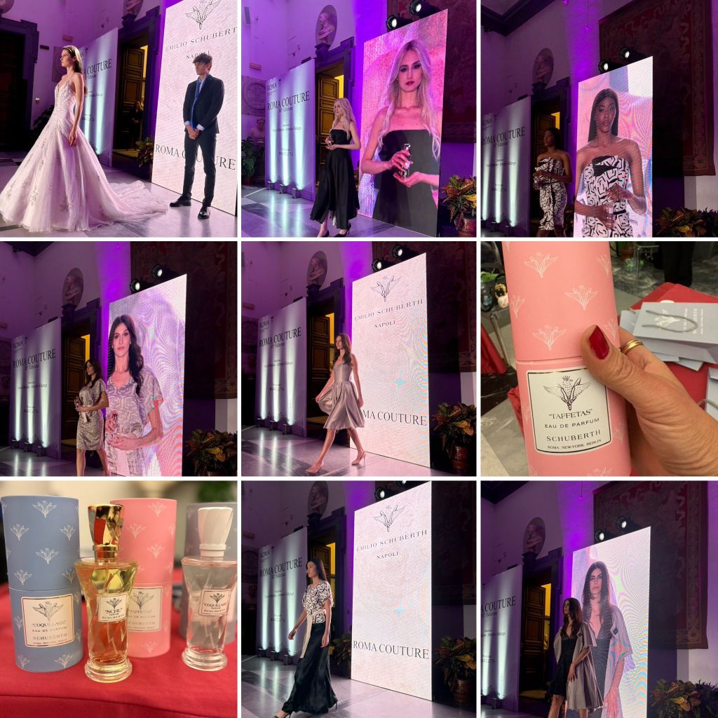 Tra le atmosfere suggestive della Roma storica, le creazioni hanno rievocato l’eredità di Emilio Schuberth, maestro dell’eleganza del dopoguerra, riletta con uno sguardo contemporaneo. A completare l’esperienza sensoriale, la presentazione delle fragranze Schu, Taffetas e Coquillage, che hanno aggiunto una dimensione olfattiva alla sfilata e che non ho resistito a provare nel backstage.