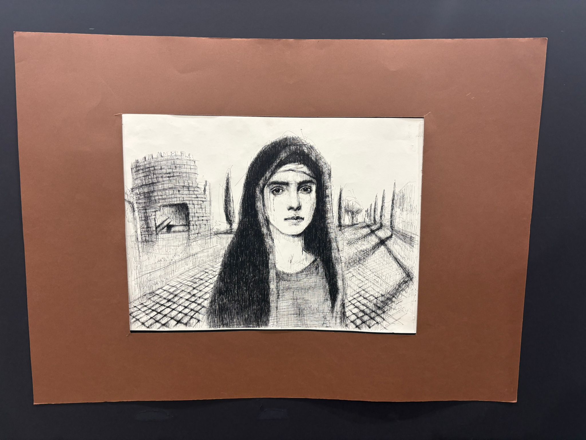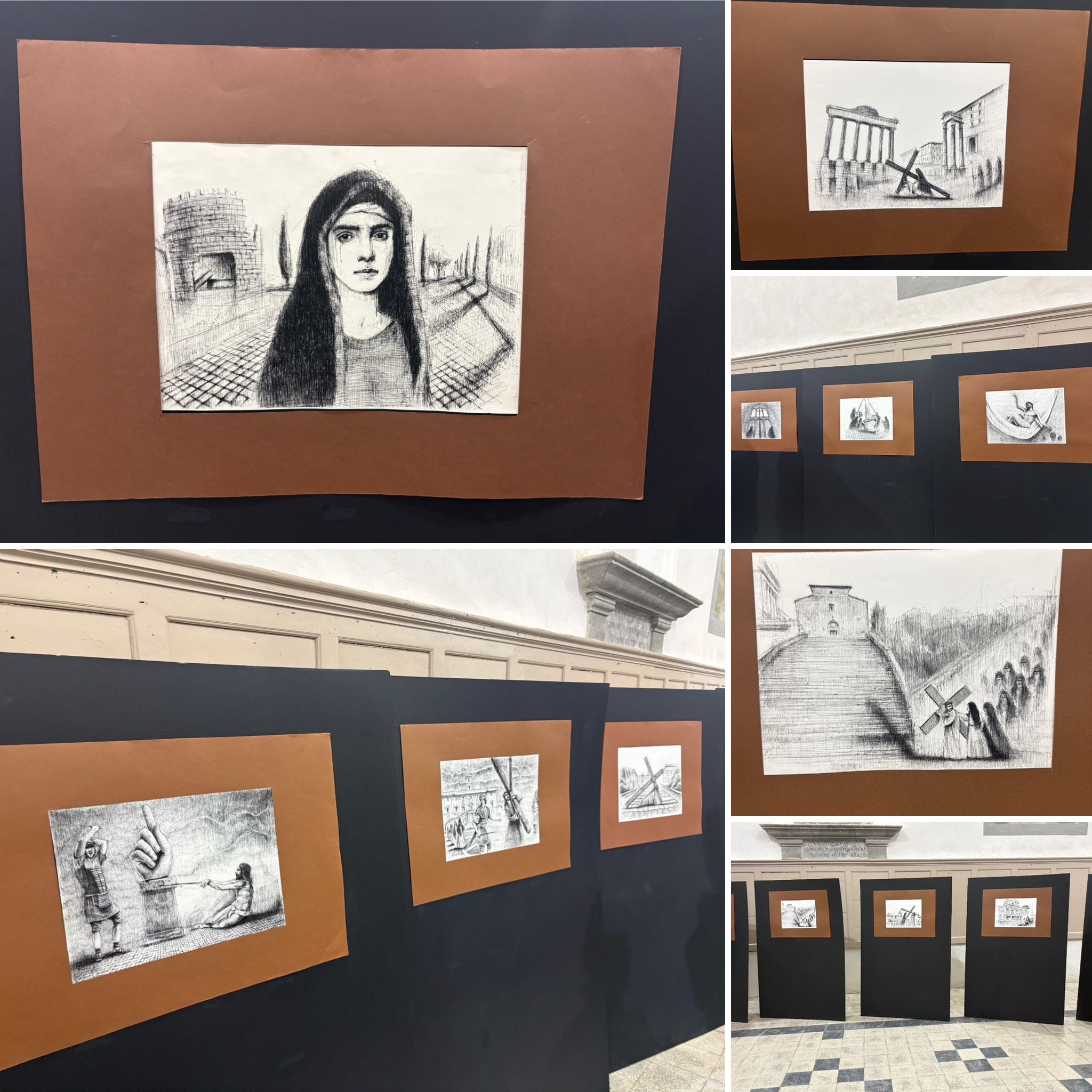Tra le opere più evocative spicca quella dedicata alla Resurrezione, vista attraverso gli occhi di Maria Maddalena. Nel disegno, la figura femminile guarda verso chi osserva l’opera mentre alle sue spalle si intravede il sepolcro ormai vuoto. È un’immagine potente e simbolica: secondo il racconto evangelico, infatti, è proprio la Maddalena la prima a incontrare Cristo risorto, motivo per cui la tradizione cristiana la definisce “Apostola degli Apostoli”. Una scelta narrativa che restituisce centralità alla figura femminile nella storia della fede.